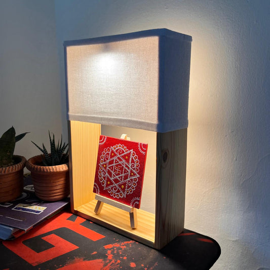 Sacred Glow – Wooden Lamp with Hand-Painted Shri Yantra Canvas Art
